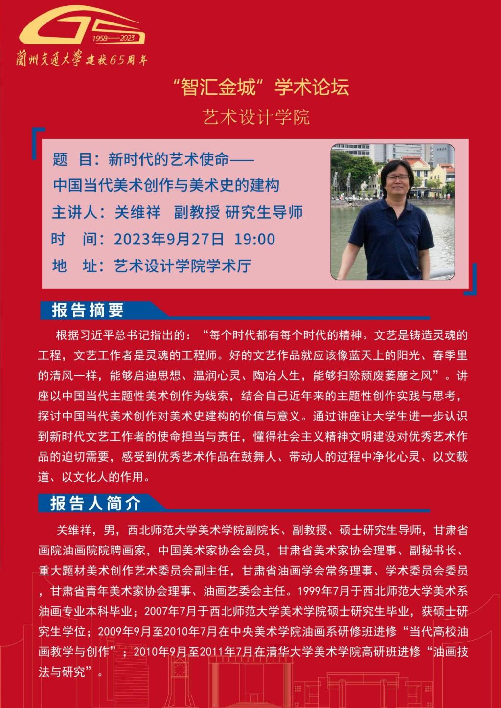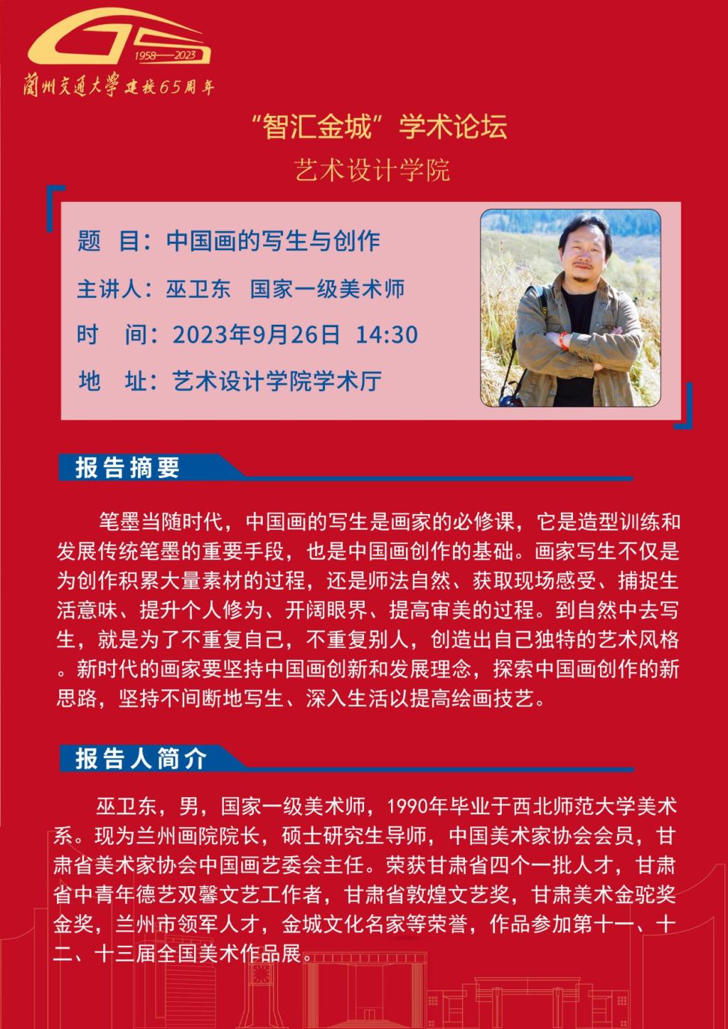 应艺术设计学院邀请,兰州画院院长巫卫东、西北师范大学美术学院副院长关维祥将为全校师生作学术报告,报告内容详情见海报。欢迎全校师生参加。