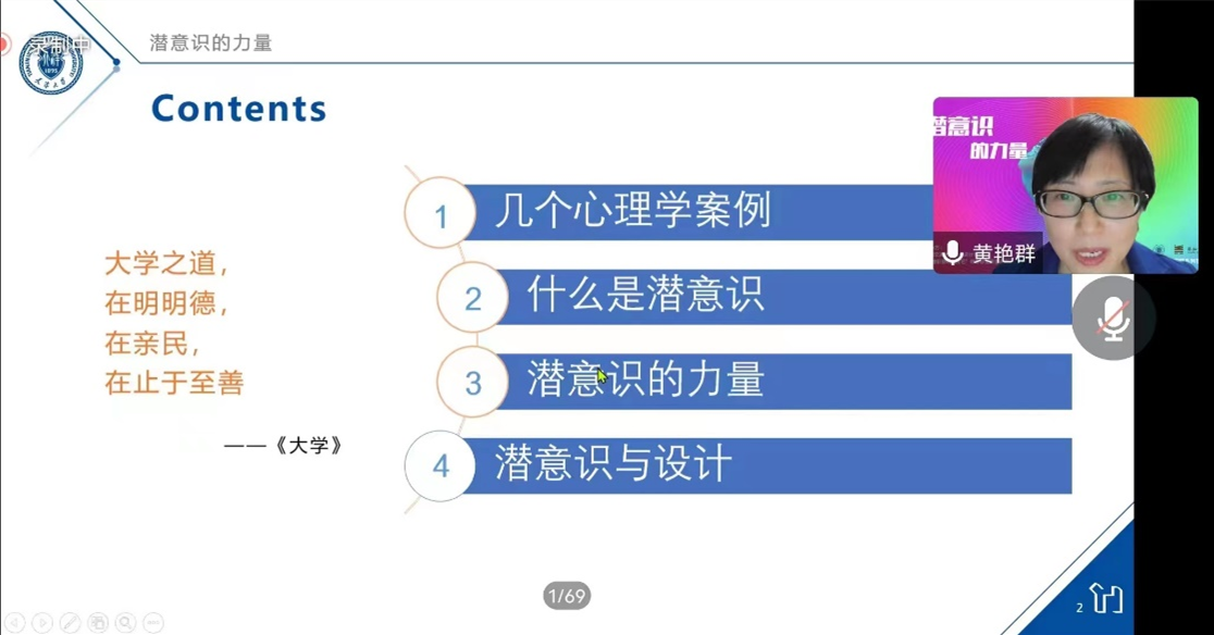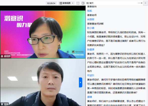 11月3日晚20:00-22:00,应艺术设计学院蓝充院长邀请,天津大学机械工程学院副教授、博士生导师、美国密西根大学访问者、天津市设计学会常务理事兼副秘书长黄艳群通过腾讯会议,在线为学院师生带来了一场主题为“潜意识的力量”的学术讲座。