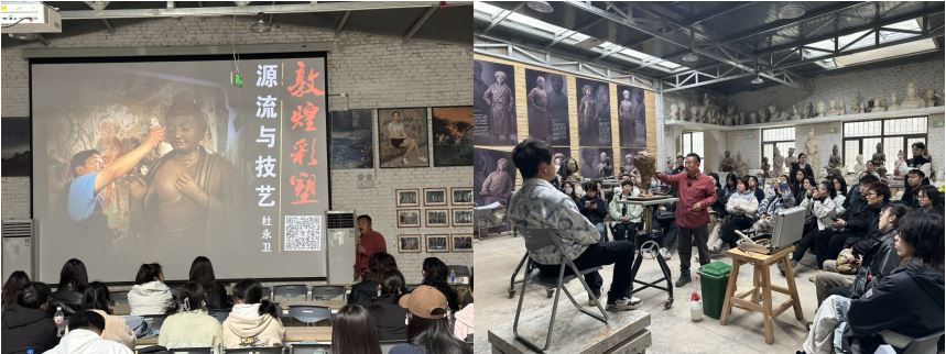 莫高里工匠村我院外聘研究生导师、敦煌彩塑非遗传承人-杜永卫老师为师生们现场示范了别开生动的泥塑头像写生及泥塑菩萨头像制作。杜老师还为参加此次研学活动的师生们呈现了一场高水平的敦煌彩塑专题讲座,详细的为大家介绍了敦煌彩塑的历史和发展,以及敦煌彩塑的制作过程。